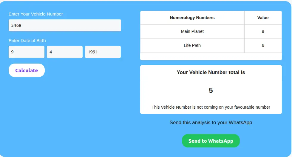 Simply enter your vehicle number and date of birth to get your vehicle number total, life path number, main planet number, and overall compatibility — all in seconds.