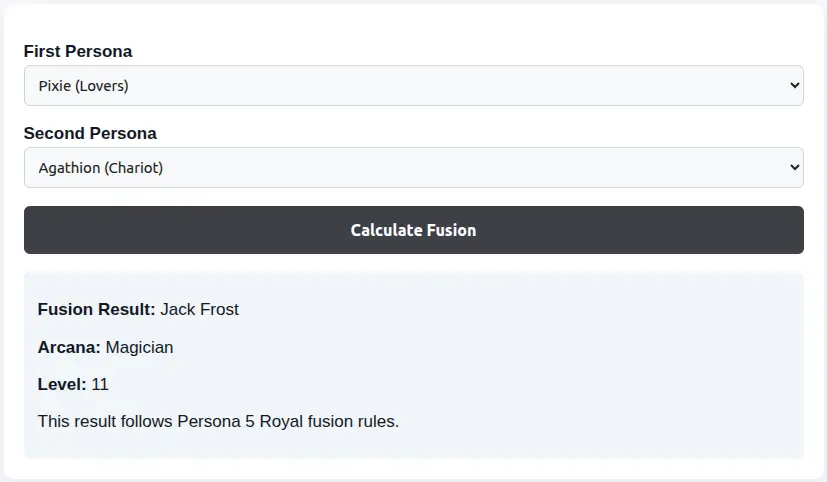 A Persona 5 Royal fusion calculator allows players to combine two Personas and see the exact resulting Persona based on official arcana rules.